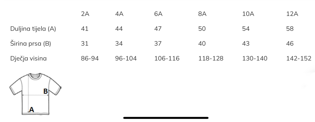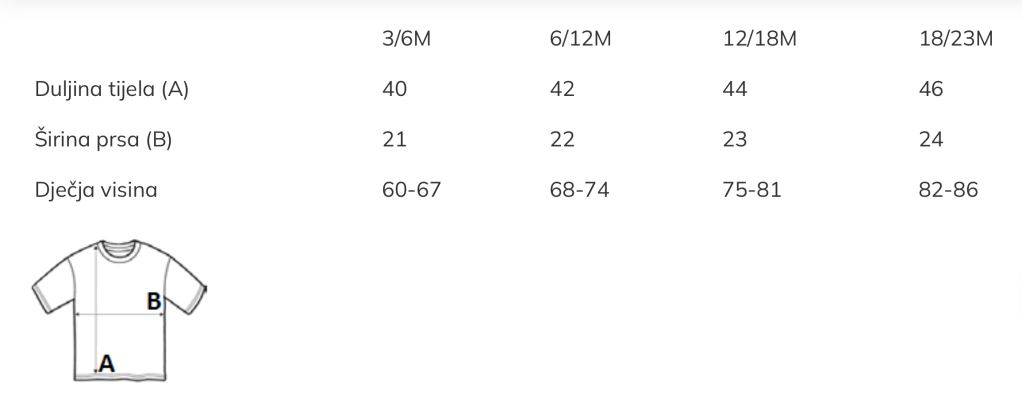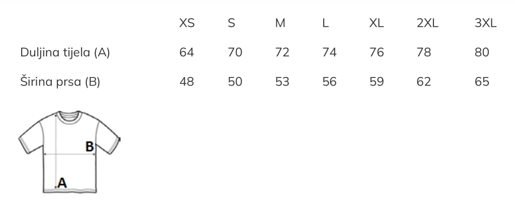 Preporuka je da uzmete majicu sličnog tipa koju već posjedujete, izmjerite širinu i dužinu kao što je prikazano u Vodiču za veličinu i na osnovu toga iz tablice odaberete odgovarajući broj.