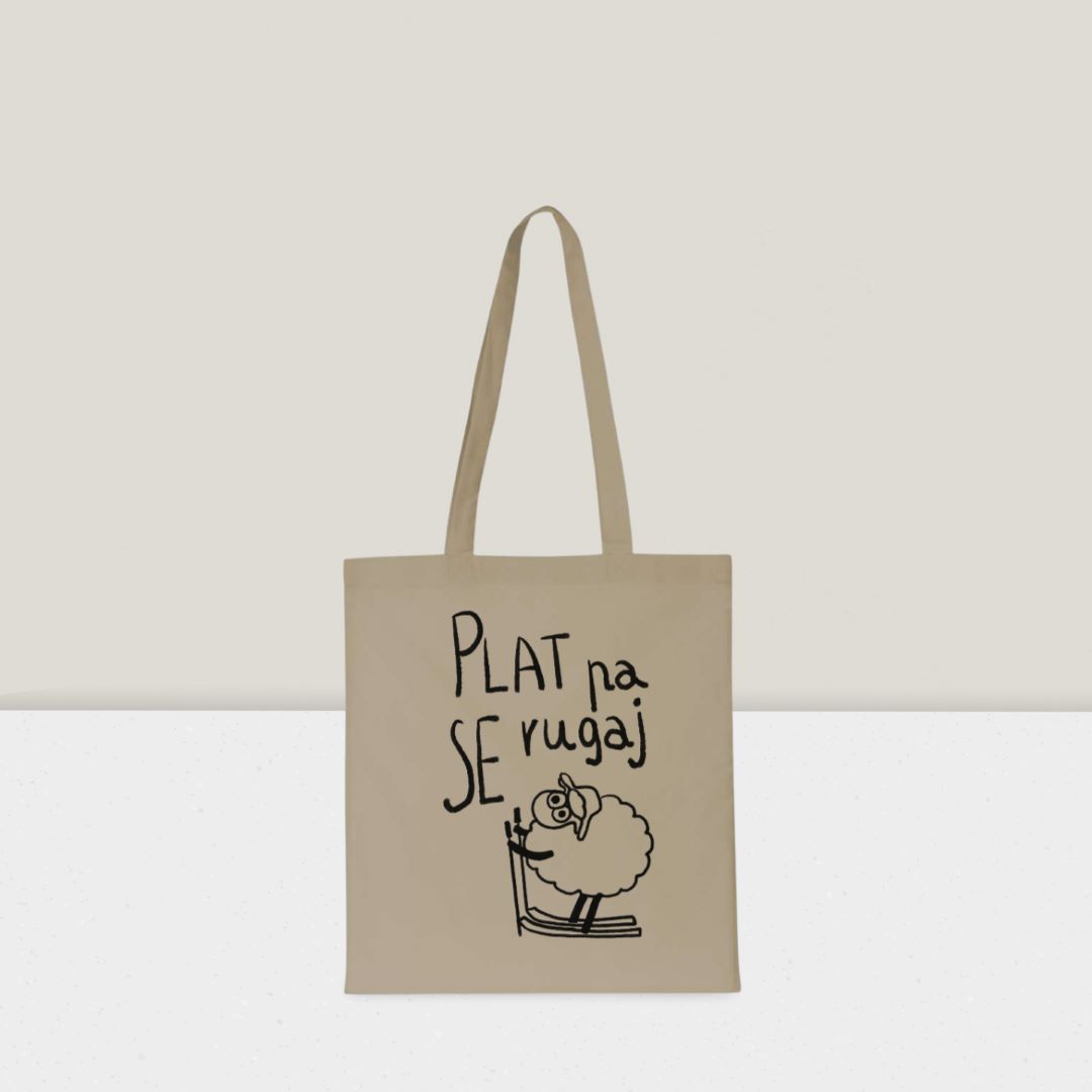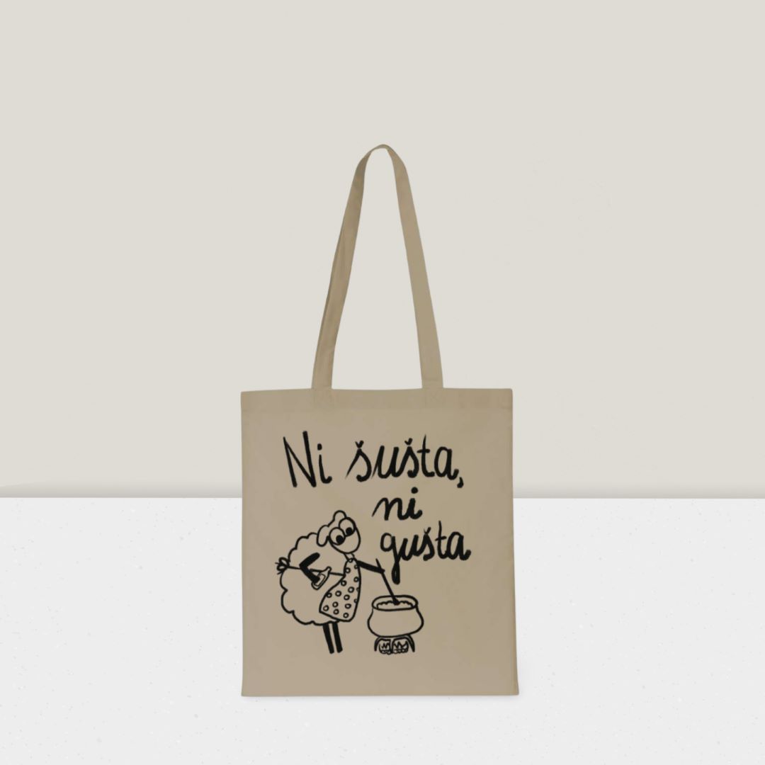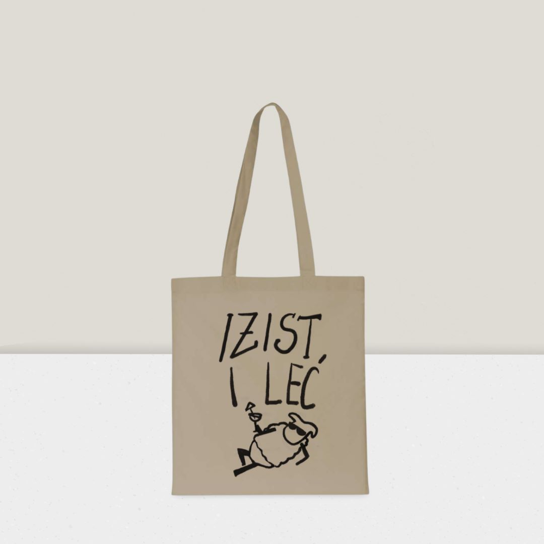 Model nosi torbu boje pijeska, motiv Ovca Izist i leć (130g), univerzalna veličina