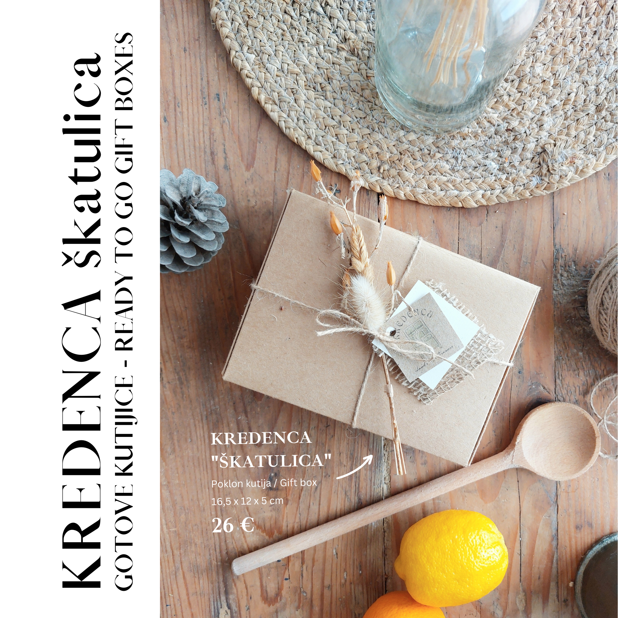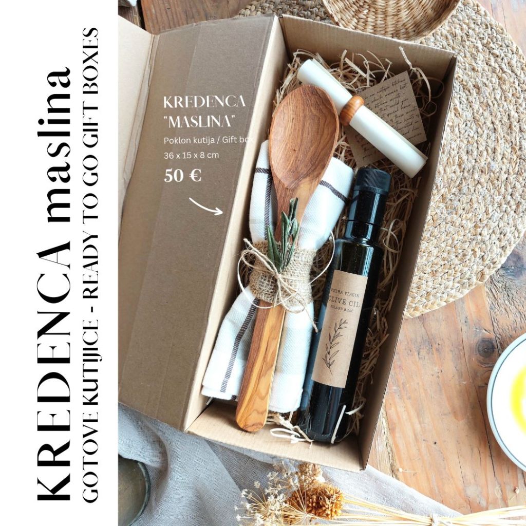 Ponesite okus Brača sa sobom – uz originalnu poklon kutiju suvenira Kredenca maslina. Linija Kredenca je inspirirana starinskim kuhinjskim ormarićem u kojem su naše none (bake) čuvale svoje male kuhinjske tajne – posebne začine koji bi svakom jelu dali onaj poseban domaći doživljaj. Dio ovih bračkih tajni ponesite sa sobom i evocirajte lijepe uspomene.