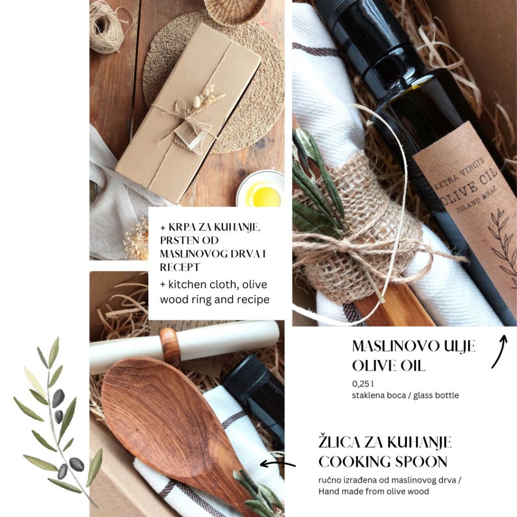 Kutija: 0,25 l ekstra djevičanskog maslinovog ulja, ručno izrađena drvena žlica od maslinovog drva s otoka Brača, krpa od 100% pamuka s držačem od maslinovog drva.