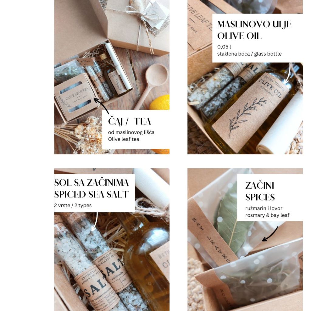Kutija: 0,05 l ekstra djevičanskog maslinovog ulja, čaj od maslinovog lista, začinjene jadranske soli, sušeni ružmarin i lovorov list.